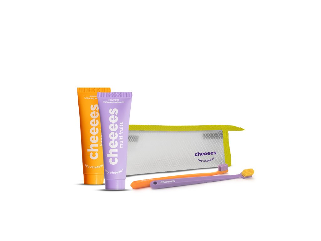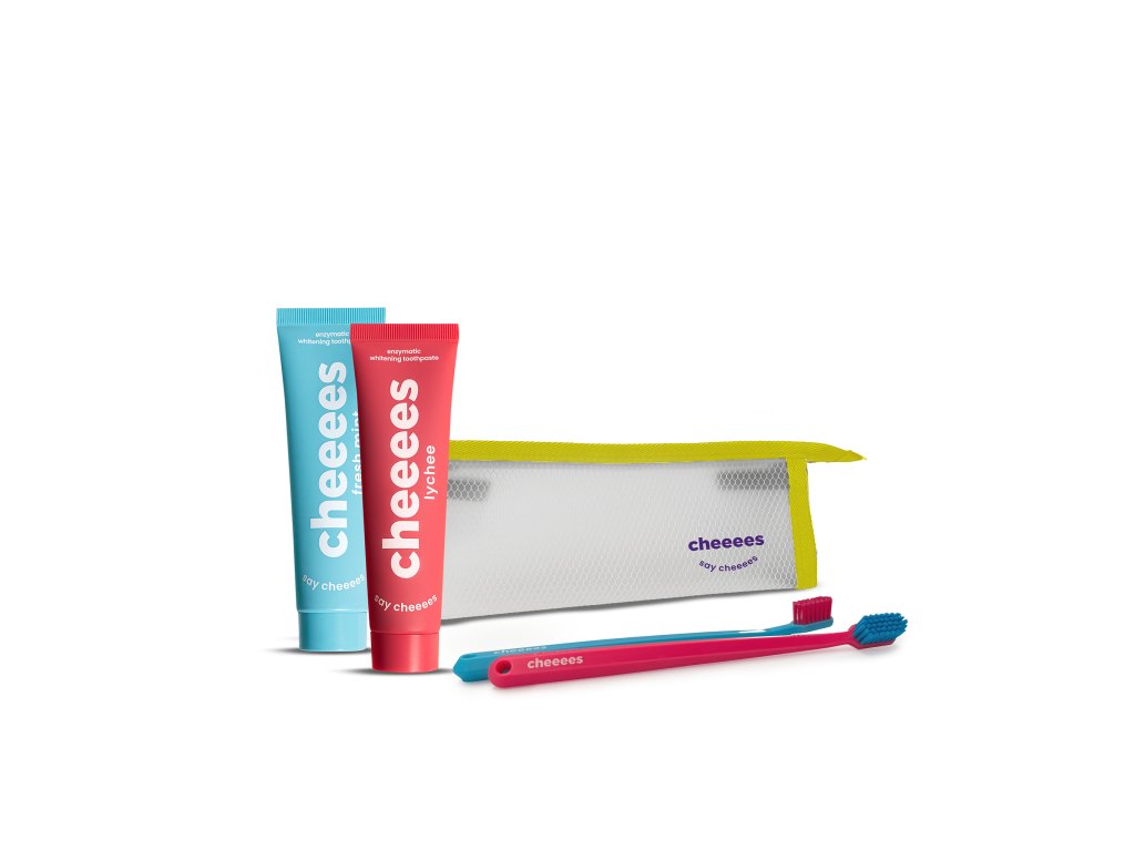Voděodolná kosmetická taštička na zip je vhodná na každou vaši cestu. Hodí se do ní třeba oblíbené enzymatické pasty a barevné zubní kartáčky Cheeees :)